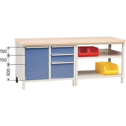 | Produktname | Werkbank komplett Modul 200 mit Schrank und Schubladen, Max. Belastung: 300 kg, Gesamthöhe: 810 mm |