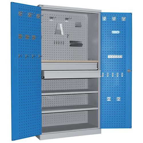 Werkstattschrank mit hochwertigen, zu 1% ausziehbaren Schubladen Türen und Rückwand sind für die Befestigung von Werkzeughaken perforiert 16 mm starker Boden