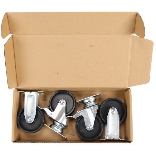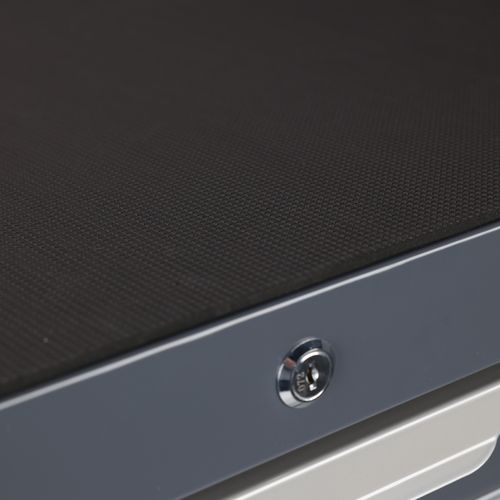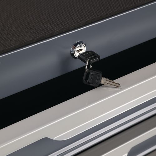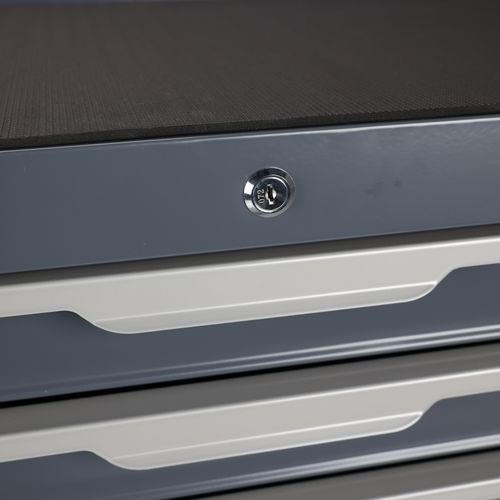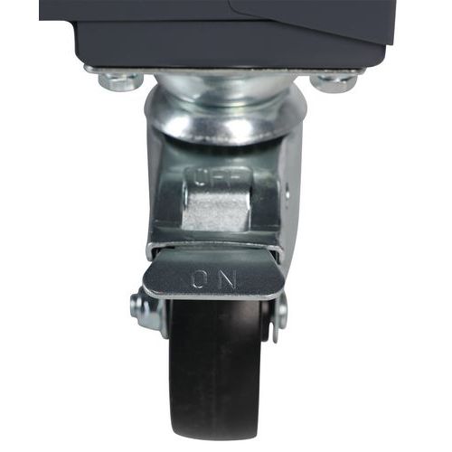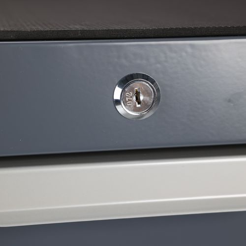 Robuster Werkstattwagen mit Stahlgestell, Farbe: Dunkelgrau RAL 7015 Hohe Sicherheit dank Zentralschloss mit Schlüssel Stabilität: optimierte Rollen, darunter 2 Bockrollen und 2 Lenkrollen mit Feststeller Komfortable Verwendung dank Griff auf einer der beiden Seiten