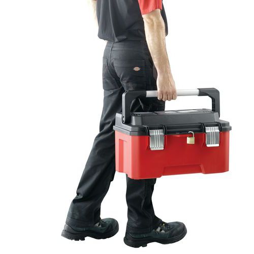 - Werkzeugkasten aus Kunststoff mit Fächern und Zwischenebene.