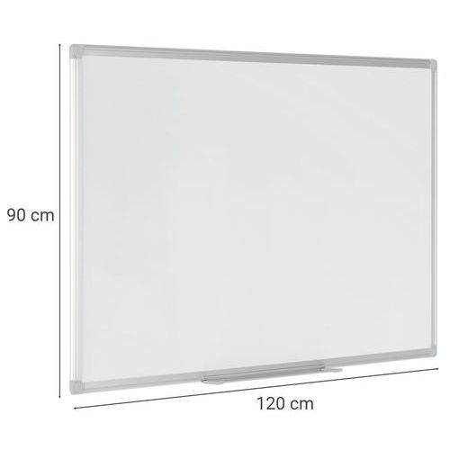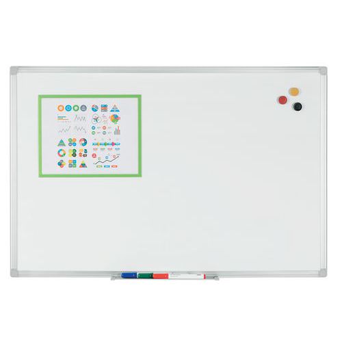 Hochwertiges lackiertes magnetisches Whiteboard Hoher Schreibkomfort durch lackierte Stahlfläche Rückseite des Whiteboards aus Holzfaser Dank der Magnetbeschichtung zum Schreiben oder Präsentieren verwendbar Robust und elegant dank Aluminiumrahmen Praktisch dank der mitgelieferten Ablage Si cancella facilmente a secco. Montaggio a parete semplice e veloce. 4 fori posteriori ai 4 angoli (diametro 3,5 mm). Fori di fissaggio nascosti da copriviti in plastica.