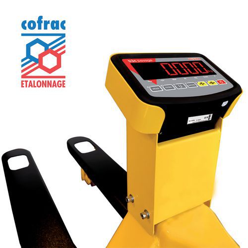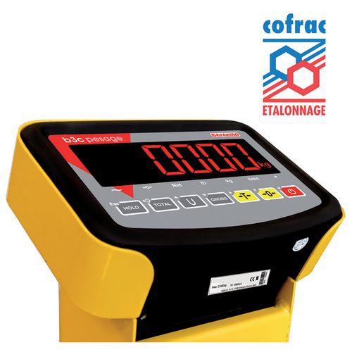 | Produktname | Wiegehubwagen, COFRAC-zertifiziert - Tragkraft 2000 kg - B3C, Max. Belastung: 2000 kg, Länge Gabel: 1160 mm |