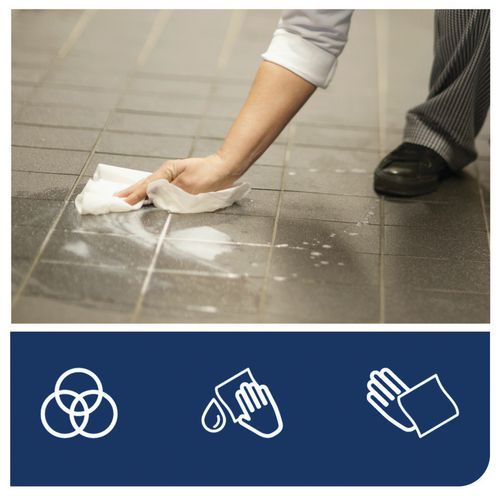Multifunktions-Wischtuchrolle Maxi Tork Plus M2. Ergonomische Verpackung im leicht zu transportierenden, zu öffnenden und zu entsorgenden Karton. Zum hygienischen Abtrocknen der Hände. Hohe Reißfestigkeit bei Nässe, sehr saugstark und sanft. Zugelassen für kurze Lebensmittelkontakte und Europäisches Umweltzeichen.