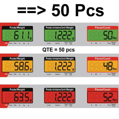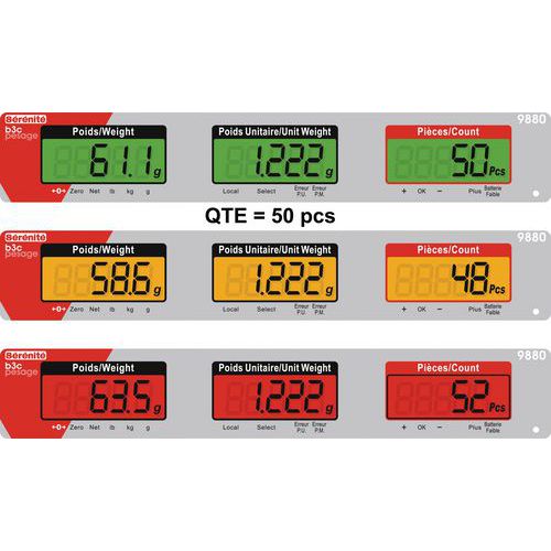 99 memorie di soglia (1 soglia = valore alto e valore basso). 3 indicatori colorati sulla colonna per visualizzare rapidamente il rispetto della soglia di tolleranza predefinita. 3 display LCD con display luminoso a tre colori. Perfetta leggibilità tramite 3 display: peso lordo o netto, peso unitario e numero di pezzi. Bilancia con tastiera digitale resistente agli urti. Uscita RS232 C per stampante. Unità: g/kg - lb.